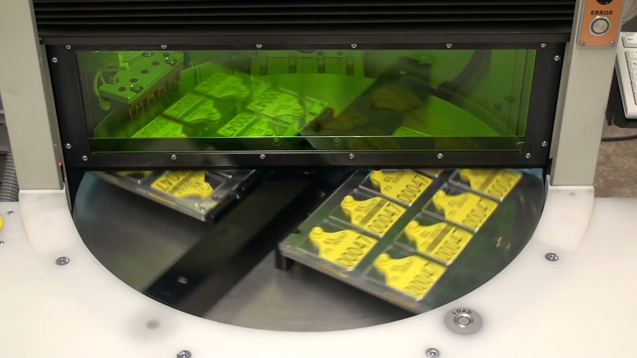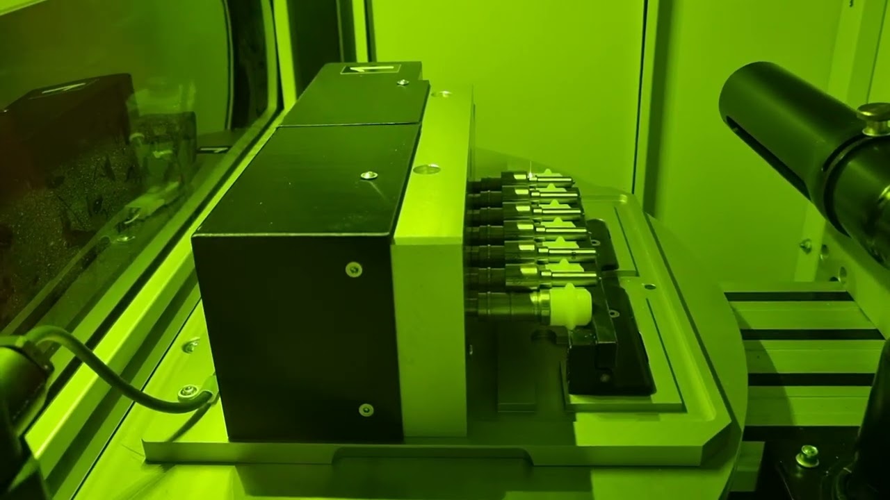 Compact industrial laser marking station with automatic rotary carousel or sliding table. Marking field from 100x100 mm to 280x280 mm.