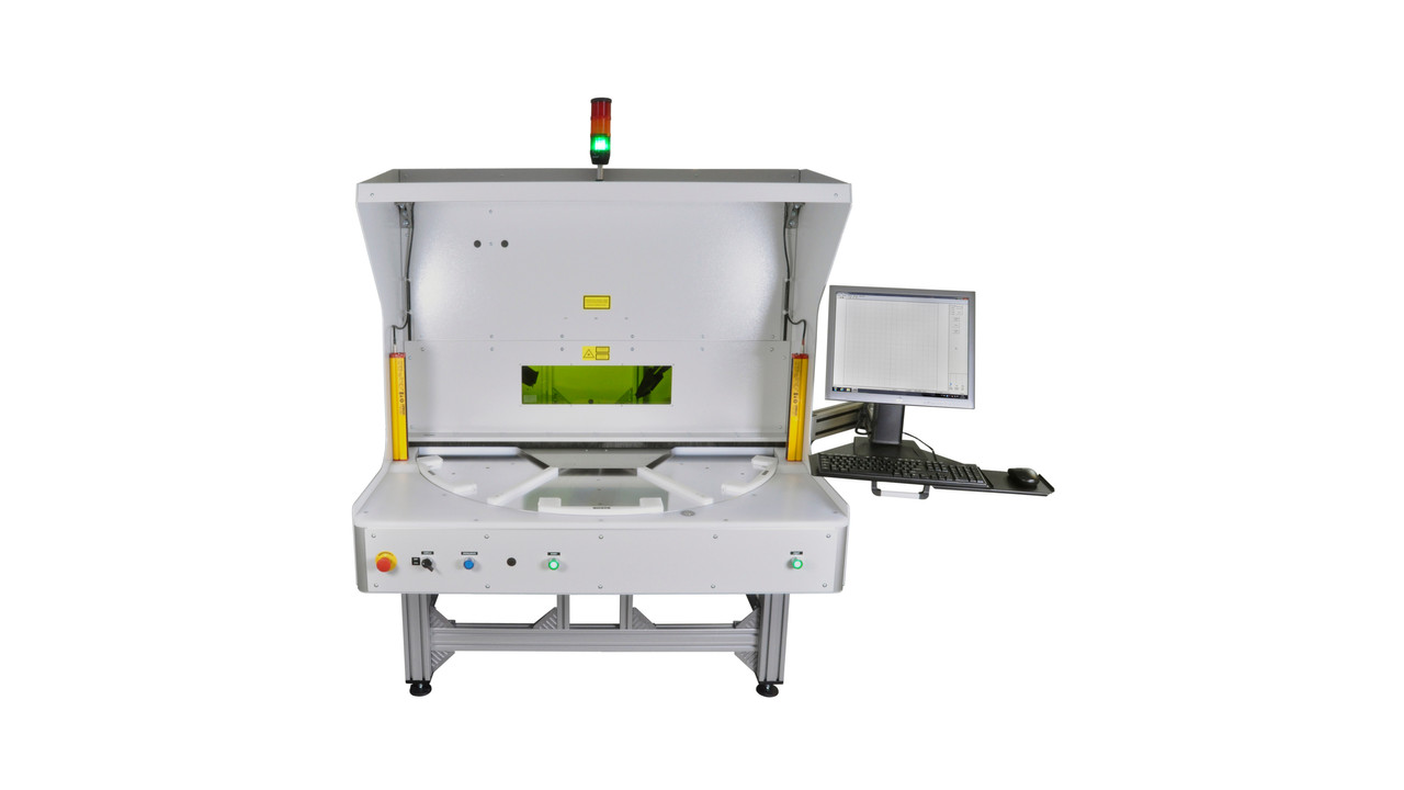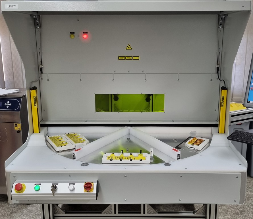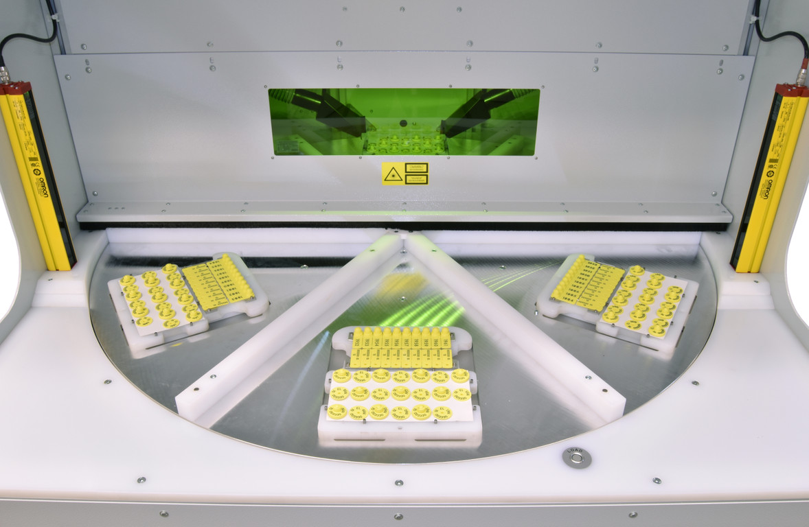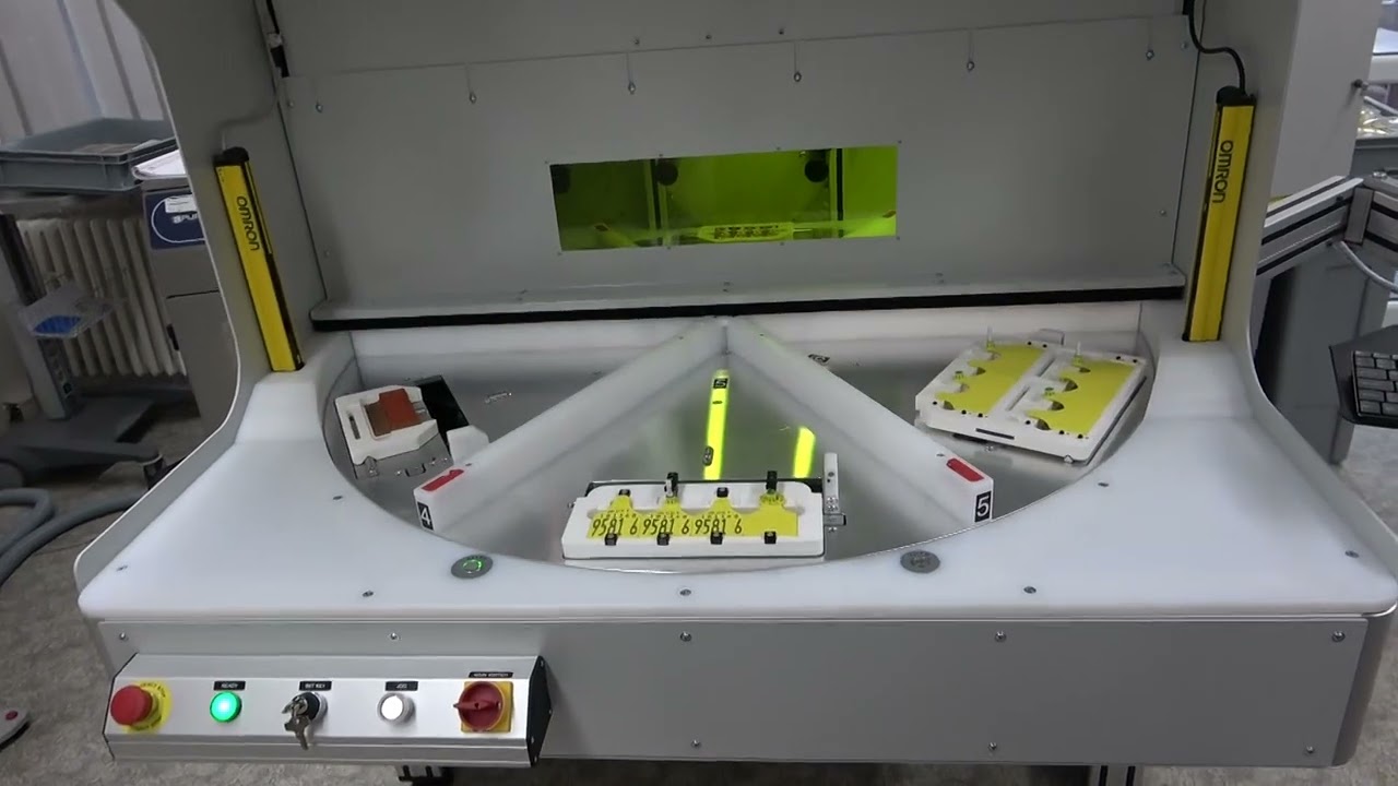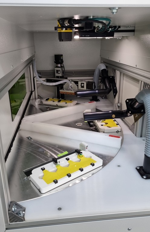 Laser marking station XL with automatic rotating carousel and fiber laser.- Laser sources fiber LF, vanadate LV or CO2 LM