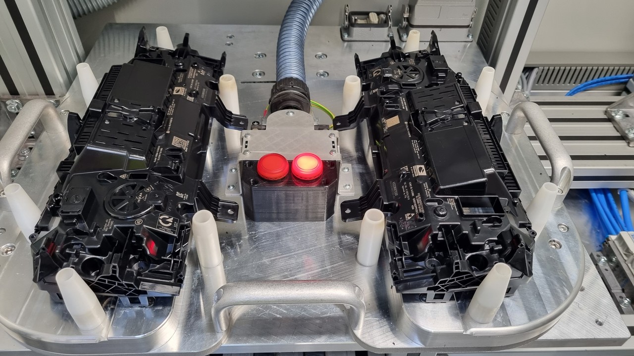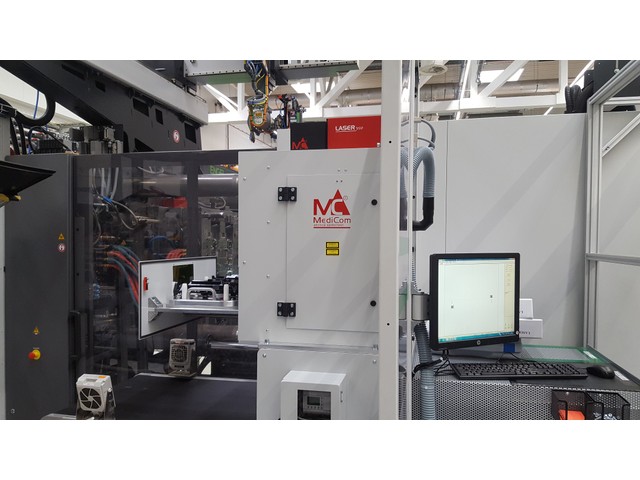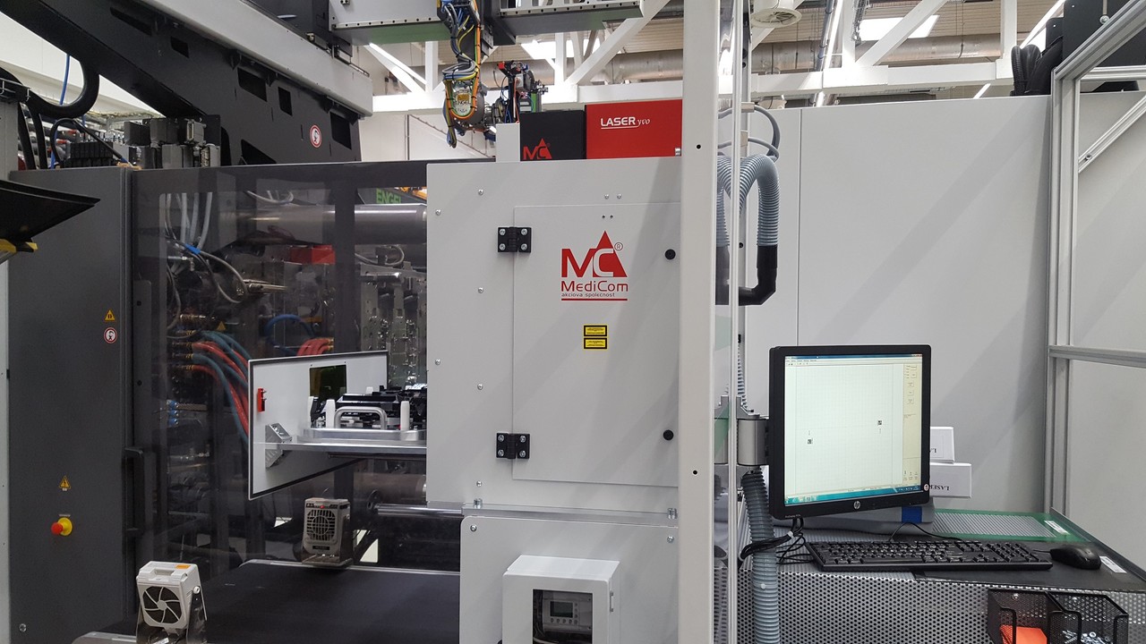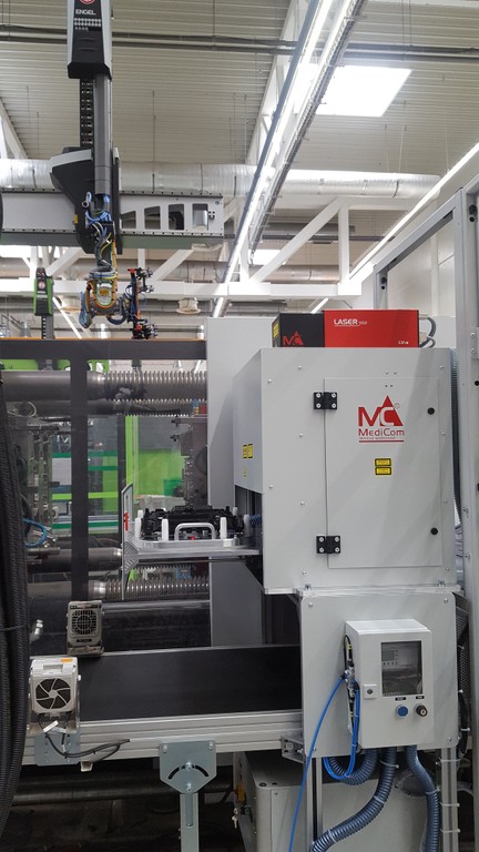The station is integrated into the production line within the injection molding machine and the output conveyor for placing the marked parts.