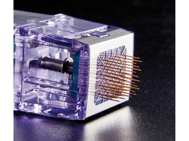 Energie se šíří od hrotu mikrojehličky ke sběrným elektrodám na povrchu kůže.