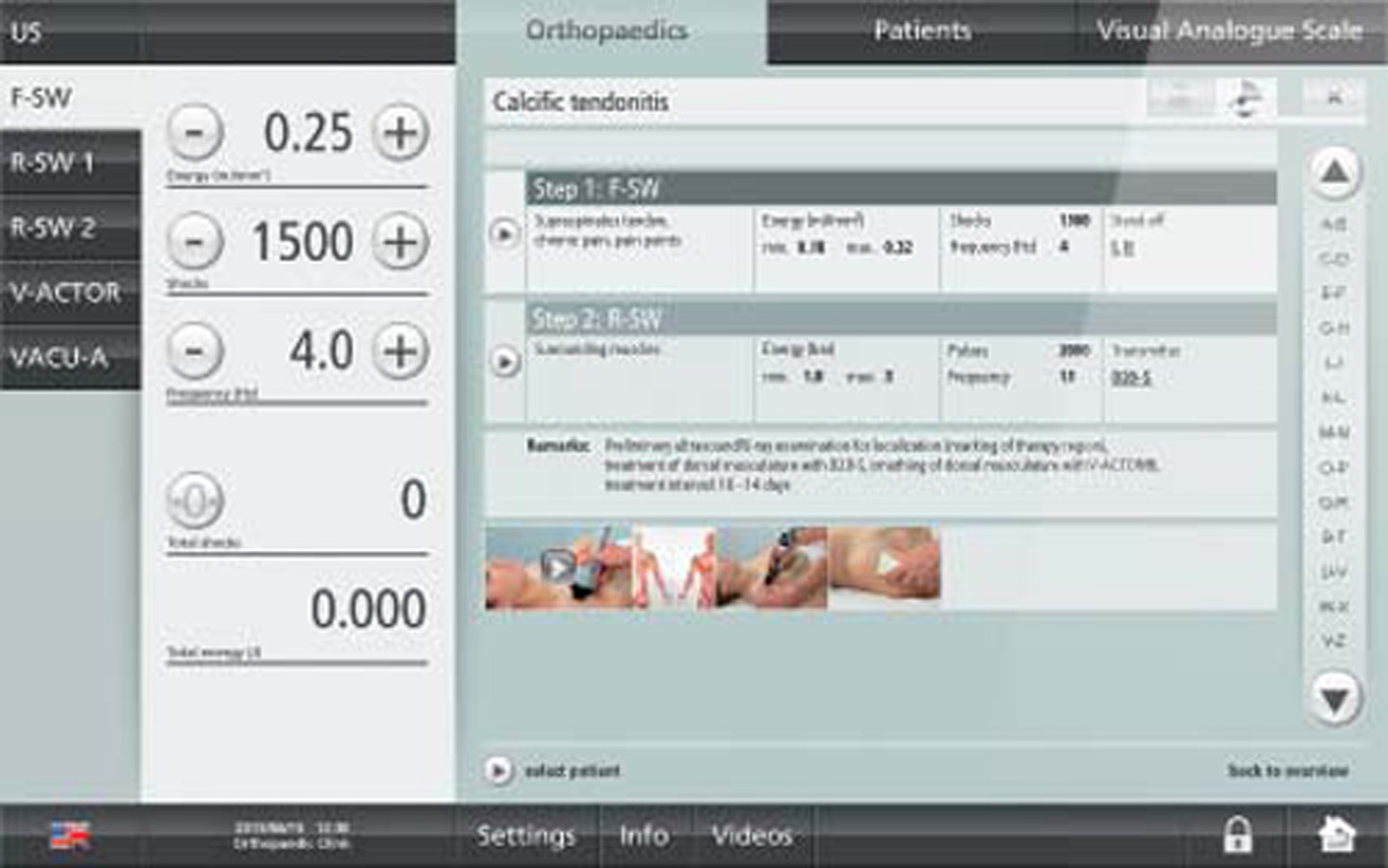Řídicí jednotka s Pain Guide a integrovaným diagnostickým ultrazvukovým zobrazováním (15,4 ”dotyková obrazovka) s R-SW modulem s radiálním FALCON aplikátorem a F-SW modul se fokusovaným SEPIA aplikátorem.