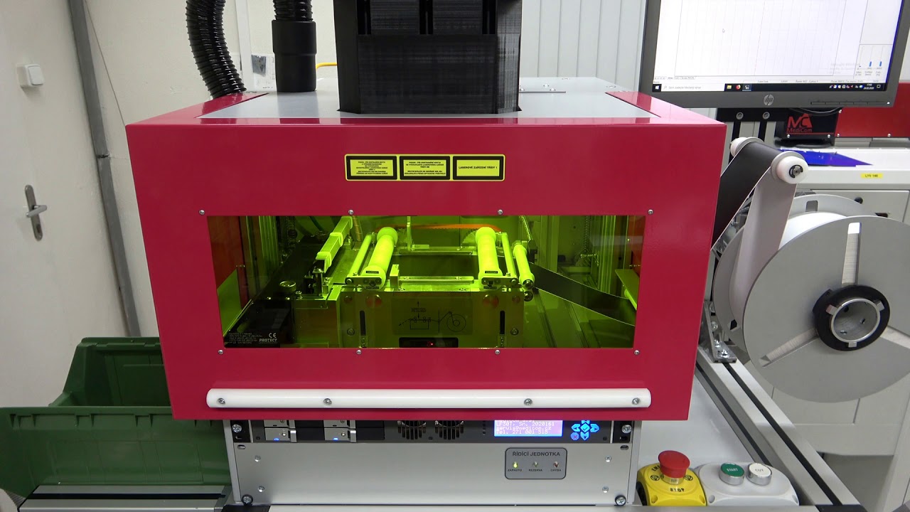 Laserová stanice pro značení a řezání samolepicích štítkůStanice je určena k výrobě samolepicích štítků ze speciálních třívrstvých samolepicích fólií (3M, TESA,Schreiner) určených k laserovému značení a vyřezání. Takto vyráběné štítky se běžně používají např. v automobilovém průmyslu jako štítky s VIN kódem nebo jako výrobní štítky aplikované na celém spektru dílů či koncových výrobků. Díky vlastnostem samolepicí folie, které neumožňují sejmutí bez poškození, lze použít štítky jako samolepící plomby. Základní provedení stanice vychází z modelové řady T osazené vláknovým laserem 10 nebo 20W doplněné o periferie navržené pro aplikaci značení a řezání štítků.