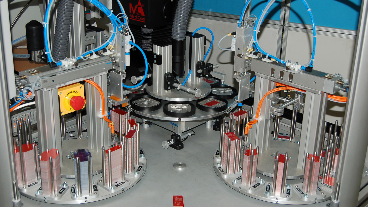 Automatická laserová stanice typ AMW-40- Kapacita vstupních a výstupních zásobníků umožňuje až několik hodin nepřetržitého provozu